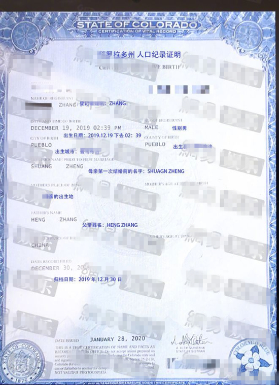 一份《科罗拉多州人口记录 出生证明》显示,男童出生时间为2019年12月19日,母亲在第一次结婚前的名字为“SHUANG ZHENG”,婴儿出生时母亲的年龄和母亲出生地未显示;父亲姓名为“HENG ZHANG”,父亲出生地中国,年龄29。