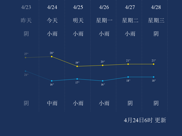 预计,今天白天小雨,最高气温28℃,微风,今天夜间中雨,最低气温16℃,微风。