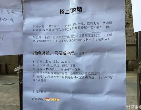 上周,在杭州万松书院的相亲会上,有人发现了一则萧山人招上门女婿的消息,而且要求很独特,写着“拒绝屌丝,只要新中产”。