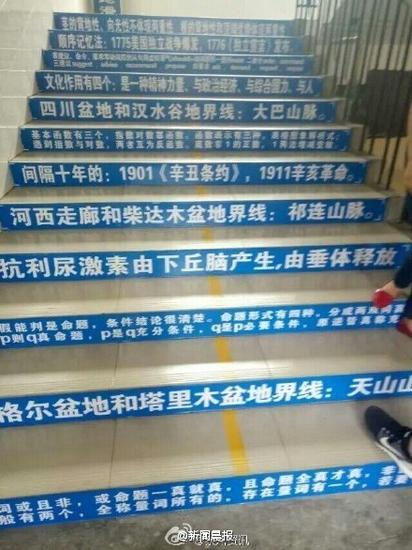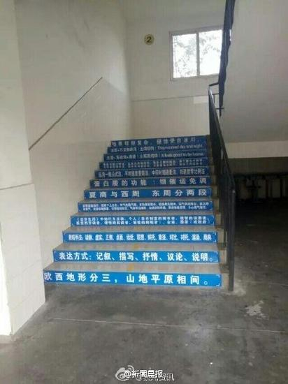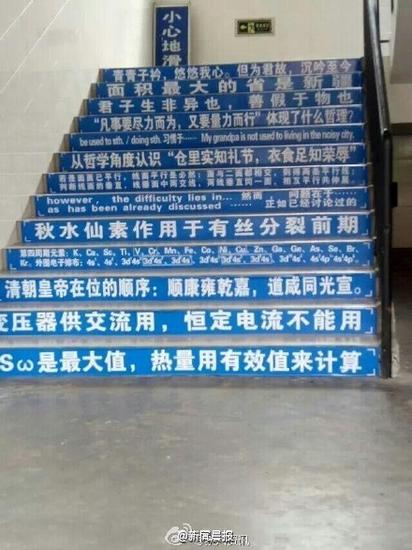 霸气!四川一中学楼梯现最牛横条! 新闻晨报 2015.09.2916:34 关注 为高考拉各种横幅已经out了!网曝成都崇庆中学的楼梯上,每级台阶都贴上了很实用的各类学科基本知识点、必记词条,方便学生们熟记。以后,同学们不仅在教室里可以学习,走个楼梯也能学习了!