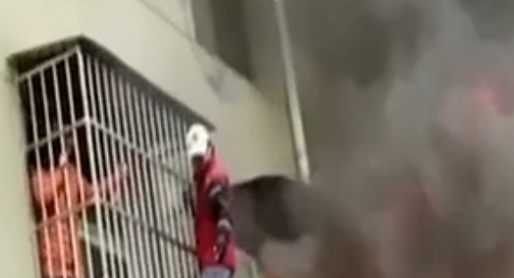 在这条10分钟左右的视频中,一栋居民楼中的一间屋子着火,火苗已蹿出窗外,并伴有大量黑烟。在着火屋子的隔壁房间,一名女子站在阳台防盗网里等待救援。而在防盗网外,一名身穿红色外套、头戴白色帽子的男子,沿着防盗网之间的空隙慢慢移动,试图救出这名女子。