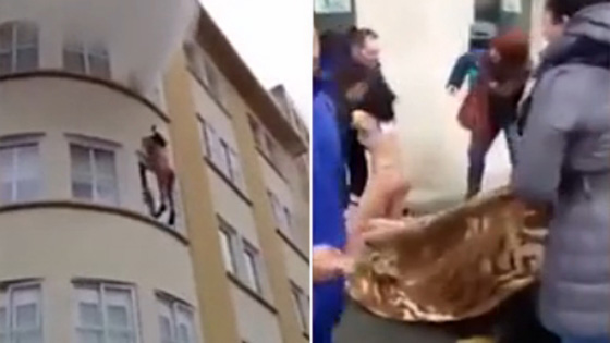 实拍家中失火女子裸身跳楼 邻居用毛毯接住