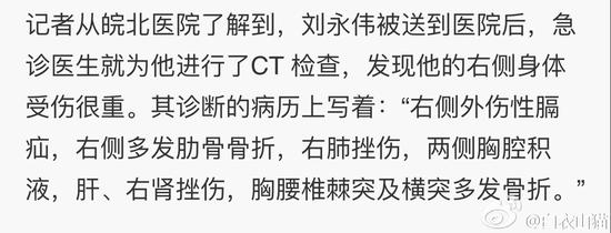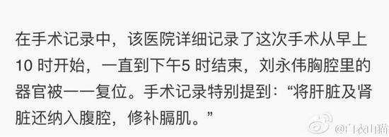 从报道上我用通俗的语言来告诉大家,医生肉眼观察了,刘永伟右肾尚完整,那就把右肾放了回去,把横膈缝合起来。
