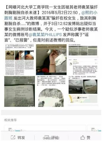 近日,有网友通过微博爆料,指河北大学工商学院一名已婚教师,与学生发生婚外恋情,并造成该学生用刀自残、割腕,精神也受到严重刺激。5月8日,河北大学工商学院通过官网回应称,涉事教师已被开除。