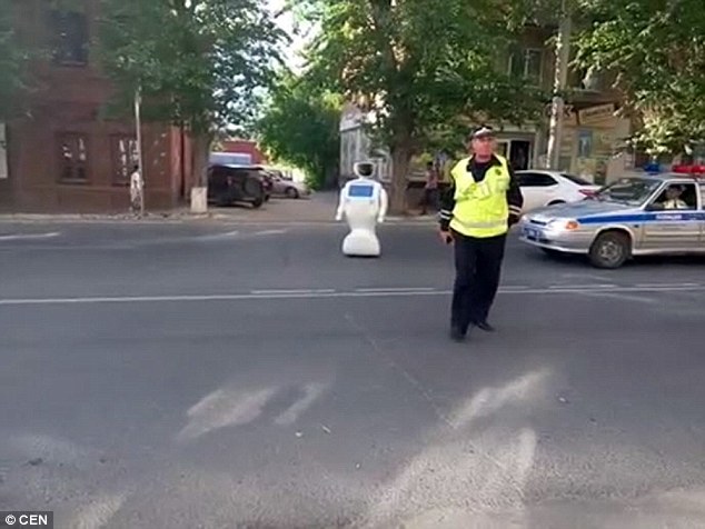 目击者拍摄的视频显示,Promobot在马路中间,交通警察过来保护它,导致了堵车。最后,机器人被从现场带走了。