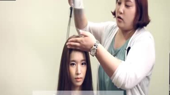 step 2:之后再用事先准备好的吹风筒从上往下吹头发,用手左右梳头发直到刘海变干。