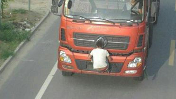 监拍男子趴货车车头 人肉挡车牌