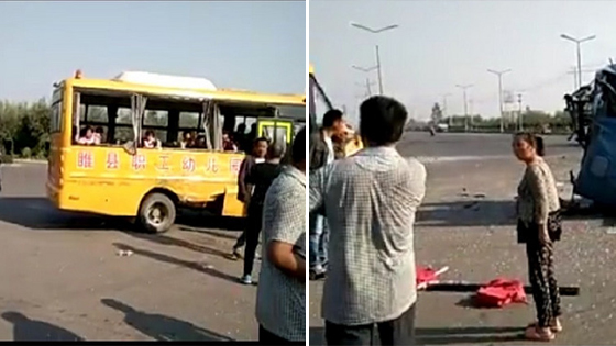 监控:河南幼儿园校车撞货车现场