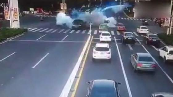监控:路虎行驶中发生爆炸