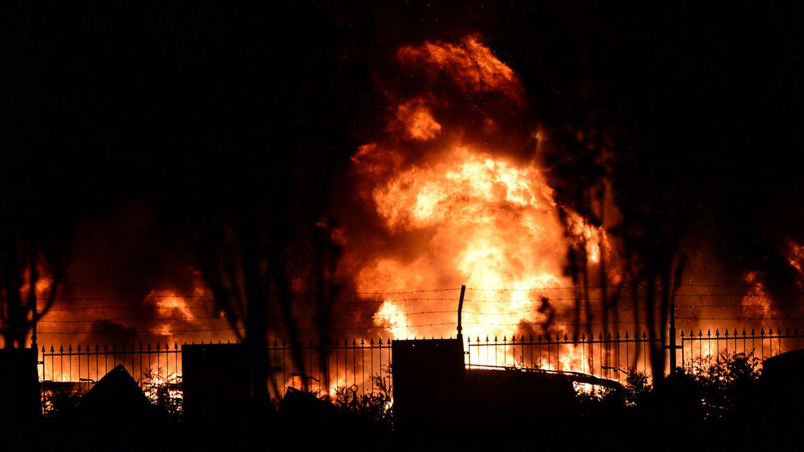 当日夜里22时许,堆场南侧的硝化棉积热自燃,随即引发周边危化物起火,随后发生爆炸。