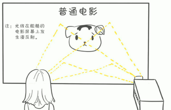 普通的电影,是一台放映机,把画面打在大屏幕上;