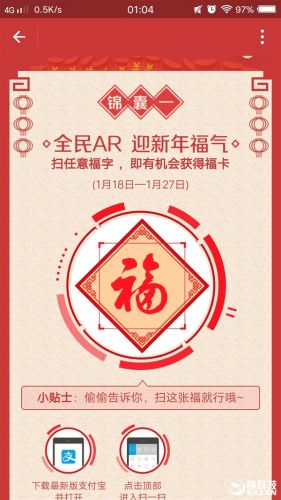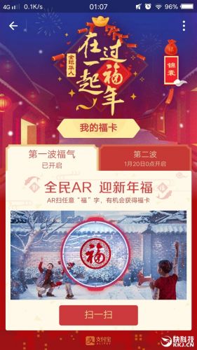 大家打开手机支付宝,在首页就能看到活动入口,使用AR扫一扫任意“福”字,就有机会领取一张福卡。