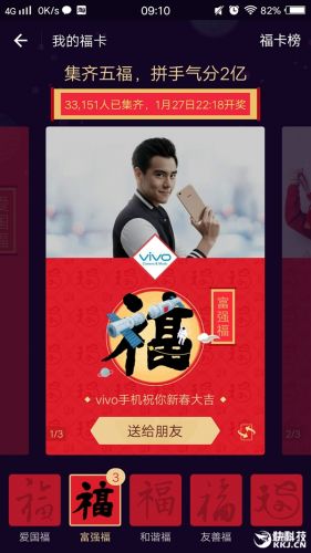 今天该活动正式启动,和去年一样,需要收集“五福”: 富强福、和谐福、友善福、爱国福和敬业福。