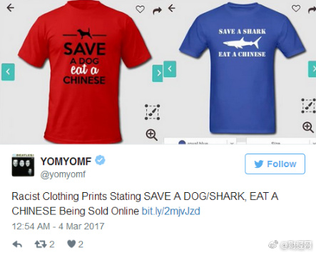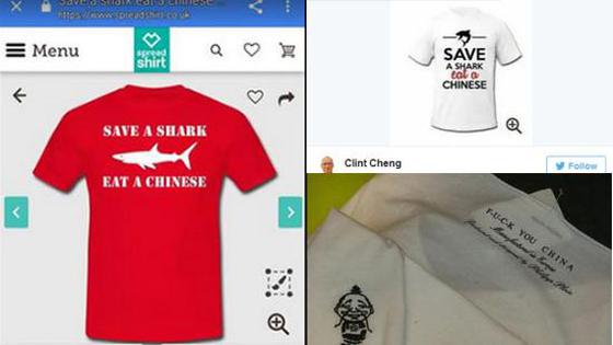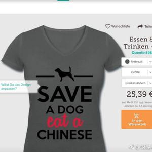近日,德国纺织服装产品定制网站Spreadshirt出售印有“救一只狗,吃一个中国人”、“救一条鲨鱼,吃一个中国人”等字样的T恤。