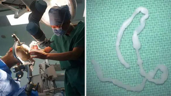 3月23日上午,杨治权主任、杨转移主治医师等专家为小李进行了开颅手术,“活捉”寄生虫。经过2个小时的开颅手术,专家们终于找到了寄生虫的位置。显微镜下,能够非常清晰地看到寄生虫在脑部蠕动。杨治权教授小心地用镊子夹住寄生虫,反复调整位置角度,慢慢地将寄生虫拖出来,2分钟后,寄生虫被完整地“活捉”出来。