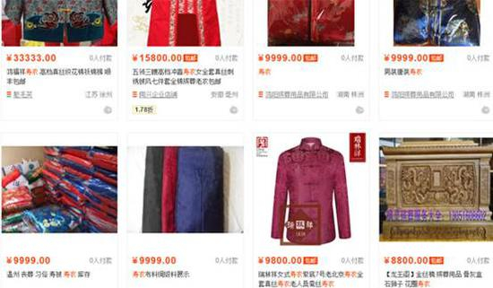 连续数年入选国内十大暴利行业的殡葬行业,不是毫无根据。淘宝上一套批发价几十元的寿衣,售价往往达上千元,价格翻了不只十倍,诸如瑞林祥等出门品牌已高达9800元。成本几块的纸扎花篮、纸钱等,也卖到了几十到几百元不等。
