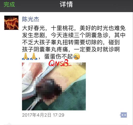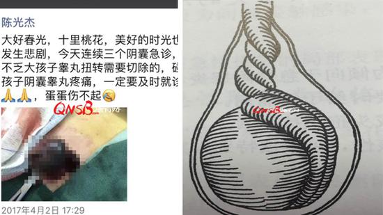 “大好春光,十里桃花,美好的时光也难免发生悲剧。今天连续三个阴囊急诊,其中不乏大孩子睾丸扭转需要切除的,碰到孩子阴囊睾丸疼痛,一定要及时就诊,蛋蛋伤不起啊!”4月2日,在忙完一天的急诊后,浙大儿院泌尿外科副主任医师陈光杰发了这样一条朋友圈,在配图中,小患者的一侧睾丸已经紫到发黑,表皮还出现了碎裂。