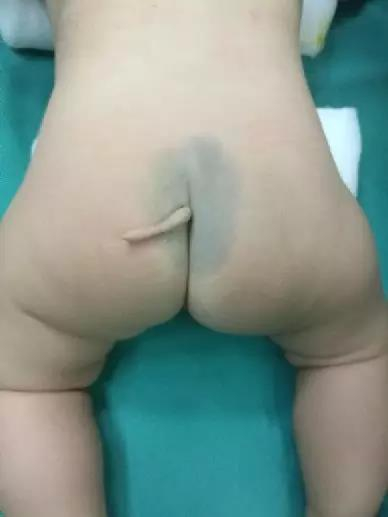 近日,安徽省儿童医院普外二科收治了这名长 “ 尾巴 ” 的五个月大女婴桃桃,其出生时便被发现屁股后拖着一条长约棉签棒,肉红色,柔软无骨,可以弯曲伸直无痛觉,看起来如动物尾巴一般的条形赘生物。