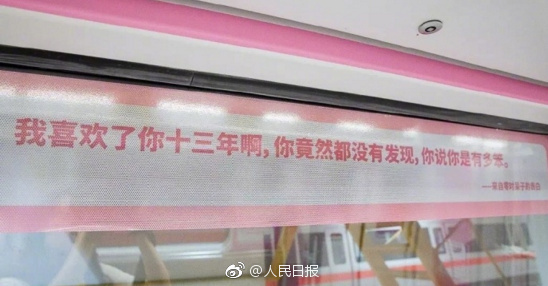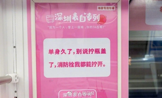 此外,地铁表白专列中还有单身专用车厢。网友回应:单身车厢扎心了!