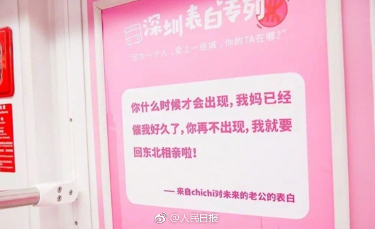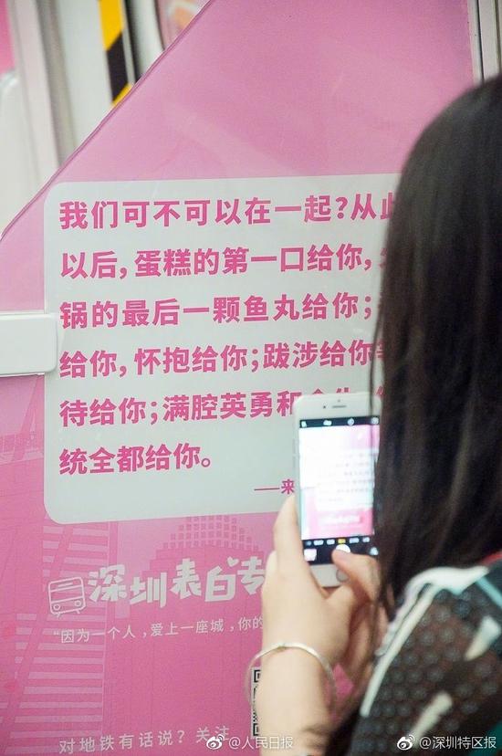5月8日,广东深圳地铁“表白专列”正式运营。这趟列车将运行1个月,每天在地铁1号线上巡回行驶。列车车厢被装饰成粉色系,印上了从网友上千条投稿中精选的表白文字。