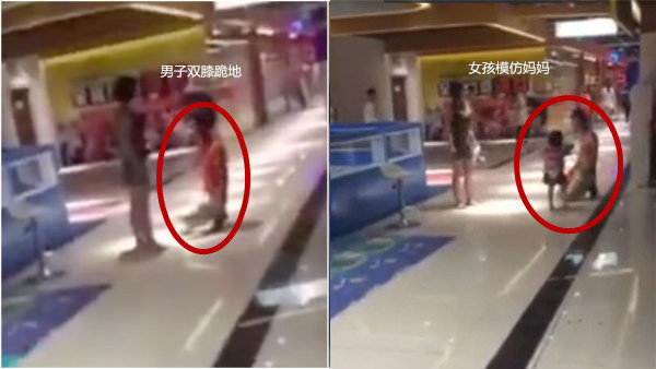 彪悍女子罚跪暴打丈夫 小女儿扔鞋全程模仿