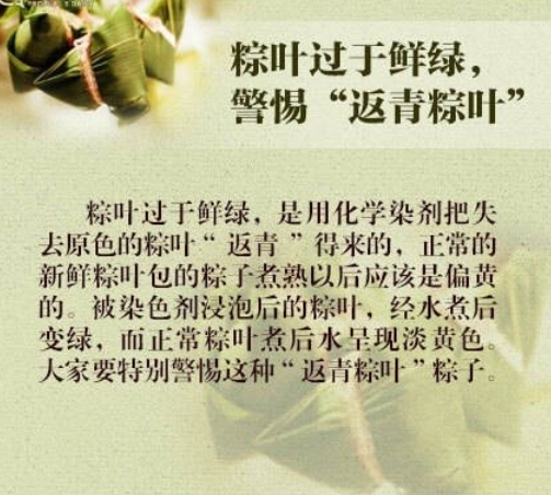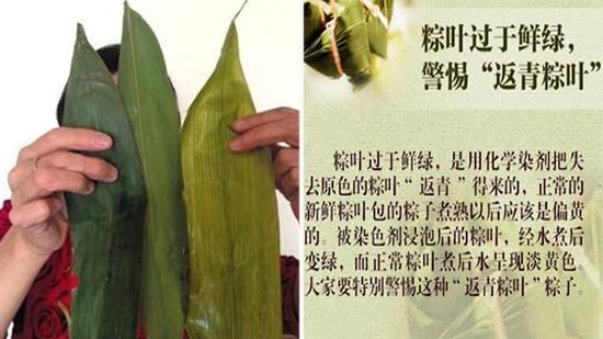 “前几天我在小区门口的摊点买了一些粽叶,回家煮了以后发现水变绿了,但叶子没有褪色,不知道是不是返青粽叶。”市民胡女士也向本报咨询,她表示,听说用“返青粽叶”包裹的粽子在加工中经过高温蒸煮,粽叶中的铜、砷、汞等元素会渗入粽子。