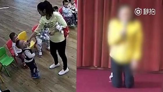 在家长见面会现场,打人老师向所有在场家长下跪道歉,“真的对不起,真的对不起,我知道我错了,现在不管说什么也没用了。”有家长现场哭诉,“一岁半的小朋友 ,喷消毒水喷在眼睛上嘴上,你受的了吗?我从昨天晚上到现在。我哭到现在,我多后悔啊,我肠子都悔的青了。”