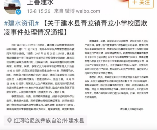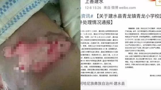 云南红河建水青龙镇青龙小学,最近,有两名三年级学生遭遇了校园暴力。这两个年级年级尚小的孩子被同班 5 名同学及 1 名六年级同学捂头、按手、按脚后脱了裤子用开水烫,伤痕惨不忍睹↓↓↓