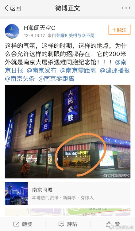 但是,该餐厅距离纪念馆不远,又在(12月13日)国家公祭日前后,“时节敏感”,在商标使用上确实“还不够规范”,他们已对商家进行劝说,要求商家将中文字样遮挡或撤下。