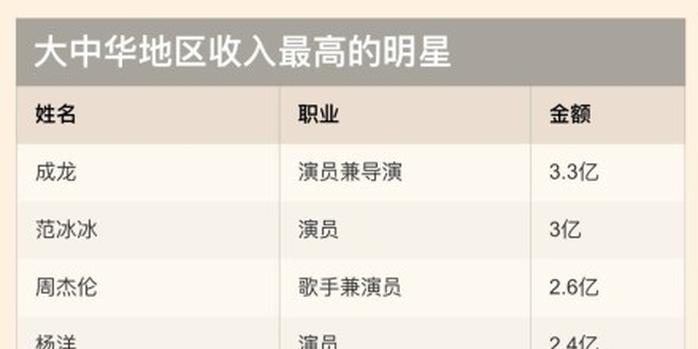 福布斯数据显示,今年中国收入最高的10位明星的合计收入超过22亿元人民币,比2015年增长了166%。影星成龙(Jackie Chan)以3.3亿元人民币的收入名列榜首↓↓↓