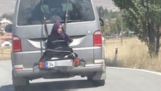 没座位?父亲将 13 岁女儿栓车尾驰行