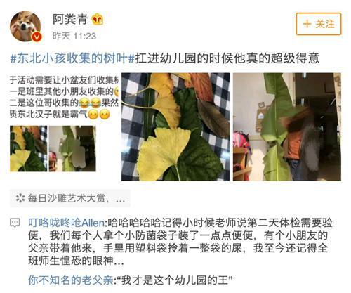 6张据了解,由于班上活动需要让有朋友们收集树叶,班里其他小朋友收集的都是银杏叶般大小的树叶,结果一个小朋友收集的树叶比他的身高还要高的树叶,需要小朋友扛着进幼儿园,更是被赞“果然符合他的气质——东北汉子就是霸气”,小编更是觉得,绝对是爸妈有才!