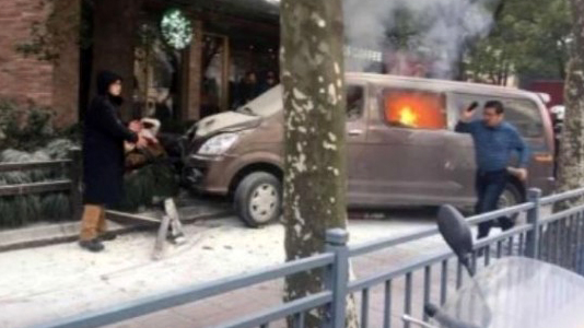 面包车起火冲入人群致18人受伤 现场实拍