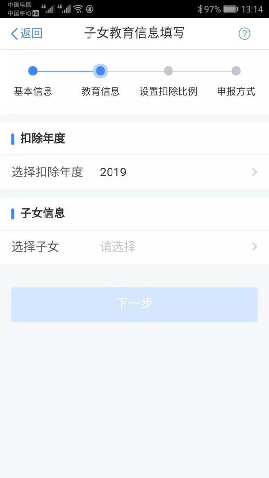 以子女教育信息为例,按照基本信息、教育信息、设置扣除比例、申报方式的流程填写。
