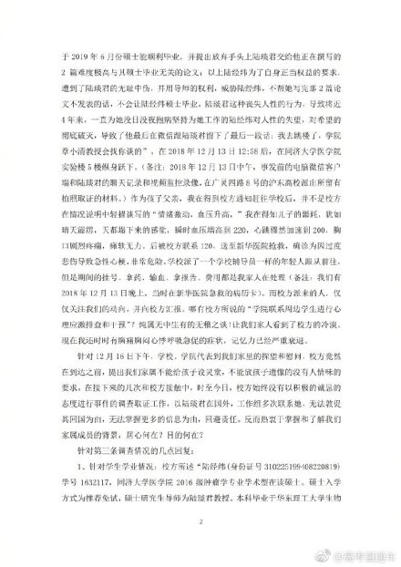 针对第二条处置情况中的更正: 校方在第二:条处置情况中所述“12月13日13时徐,学院接到信息:有人从医学楼辅楼坠楼。”这样的描述闪烁其词、越盖弥彰的说法不符合真实情况。客观事实是:2018年12月13日中午,在同济大学医学院实验大楼5楼,同济大学医学院教授陆琰君的509实验室,陆经纬在实验过程中与客居芬兰的导师陆琰君在实验室的电脑上,通过微信客户端进行交流,交流过程中,涉及到2015年7月初至今,陆经纬几乎每年365天,没有节假日,无休无止、无偿的为导师陆琰君工作,其中绝大部分工.作与陆经纬本身所学的专业没有关系,仅仅为即将退休的导师陆琰君博取更多的名利;也涉及到2019年4月考博的报名费,因导师陆琰君的延误,导致2019年4月无法考博;也跟陆琰君谈到了因为自己于2019年4月已经无法考博,所以决定放弃了考博,希望于2019年6月份硕士能顺利毕业,并提出放弃手头上陆琰君交给他正在撰写的2篇难度极高与其硕士毕业无关的论文:以上陆经纬为了自身正当权益的要求,遭到了陆琰君的无耻中伤,并用导师的权利,威胁陆经纬,不帮她写完那2篇论文不发表的话,不会让陆经纬硕上毕业。陆琰君这种丧失人性的行为,导致将近4年米,一直为她没日没夜抱病坚持为她工作的陆经纬对人性的失望,对希望的彻底破灭,导致了他最后在微信跟陆琰君留下了最后一段话:我去跳楼了,学院章小清教授会找你谈的”。在2018年12月13日12:58后,在同济大学医学院实验楼5楼纵身跃下。(备注: 2018年12月13日中午,事发前的电脑微信客户端和陆琰君的聊天记录和视频监控录像,在广灵四路8号的沪东高校派出所留有拍照取证的材料。》作为孩子父亲,我在得到校方通知赶往学校后,并不是校方在情况说明中轻描谈写的“情绪激动,血压升高,”我在得知儿子的關耗,犹如晴天霹雳,天都塌下来的感觉,瞬时血压增高到220,心跳骤然加速到200,胸口剧烈疼痛,瘫软无力。后被校方联系120,送至新华医院抢救,确诊为因过度悲伤导致急性心梗,非常危险。学校派了一个学校辅导员一样的年轻人跟从前往,但是期间的挂号、拿药,输血、拿报告、费用都是我家人在处理(备注;我们有2018年12月13日晚上,当时在新华医院急救的病历卡)。而校方派来的人,仅仅关注我们的动向,并向校方汇报。哪有校方所说的“学院联系周边学生进行心理应激排查和干预”?纯属无中生有的无稽之谈!让我们家人看到了校方的冷漠。现在我还时时有胸痛胸闷心悸呼吸急促的症状,记忆力已经严重衰退。