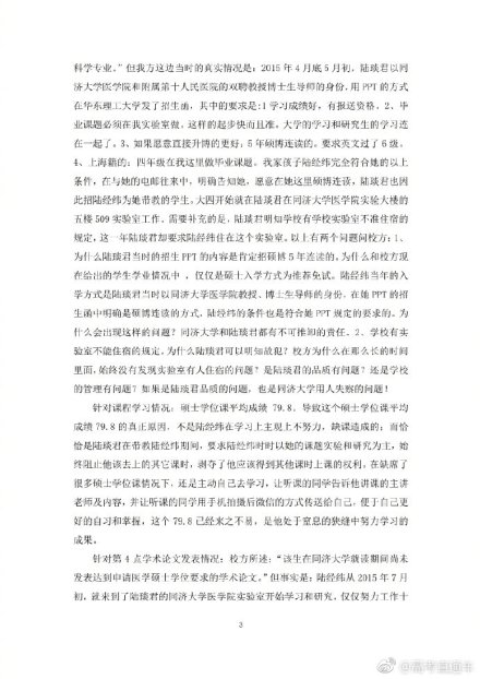 1、针对学生学业情况:校方所述“陆经纬(身份证号310225199408220819)学号1632117,同济大学医学院2016级肿瘤学专业学术型在读硕士。硕士入学方式为推荐免试,硕士研究生导师为陆琰村教授。本科毕业于华东理工大学生物科学专业。”但我方这边当时的真实情况是: 2015年4月底5月初,陆琰君以同济大学医学院和附属第十人民医院的双聘教授博士生导师的身份,用PPT的方式在华东理L大学发了招生函,其中的要求是:1学习成绩好,有报送资格。2、毕业课题必须在我实验室做。这样的起步快而且准。大学的学习和研究生的学习连在一起了。3、如果愿意直接升博的更好: 5年硕博连读的。要求英文过了6级。4、上海籍的:四年级在我这里做毕业课题。我家孩子陆经纬完全符合她的以。上条件,在与她的电邮往来中,明确告知她,愿意在她这里硕博连读,陆琰君也因此招陆经纬为她带教的学生。大四开始就在陆琰君在同济大学医学院实验大楼的五楼509实验室工作。需要补充的是,陆琰君明知学校有学校实验室不准住宿的规定,这一年陆琰君却要求陆经纬住在这个实验室。以上有两个问题问校方:1、为什么陆琰君当时的招生PPT的内容是肯定招硕博5年连读的。为什么和校方现在给出的学生学业情况中,仅仅是硕士入学方式为推荐免试。陆经纬当年的入学方式是陆琰君当时以同济大学医学院教授、博士生导师的身份,在她PPT的招生函中明确是硕博连读的方式,陆经纬的条件也是符合她PPT规定的要求的。为什么会出现这样的问题?同济大学和陆琰君都有不可推卸的责任。2、学校有实验室不能住宿的规定,为什么陆琰君可以明知故犯?校方为什么在那么长的时间里面,始终没有发现实验室有人住宿的问题?是陆琰君的品质有问题?还是学校的管理有问题?如果是陆琰君品质的问题,也是同济大学用人失察的问题!