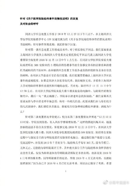 同济大学应急处置工作组于2018年12月27日下午三点半,在上海同济大学医学院实验教学中心139室递交我方的《关于医学院陆经纬事件的情况说明》书面材料,针对事件客观真相,我们作如下回复。