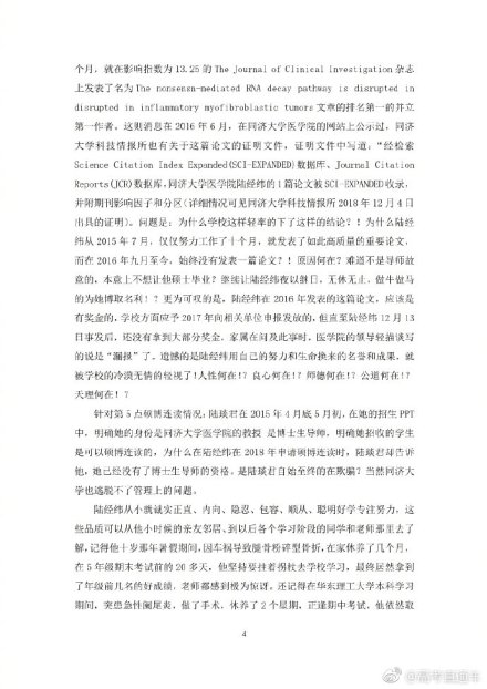 针对第4点学术论文发表情况:校方所述:“该生在同济大学就读期间尚未发表达到申请医学硕士学位要求的学术论文。”但事实是:陆经纬从2015年7月初,就来到了陆琰君的同济大学医学院实验室开始学习和研究,仅仅努力工作十个月,就在影响指数为13. 25的The Journal of Clinical Investigation 杂志上发表了名为The nonsensn-mediated RNA decay pathway is disrupted in disrupted in ? infl amnatory myof ibroblastic tumors 文章的排名第一的并立第一作者。这则消息在2016年6月,在同济大学医学院的网站上公示过,同济大学科技情报所也有关于这篇论文的证明文件,证明文件中写道:“经检索Science Citation Index Expanded (SCI-EXPANDED)数据库、Journal Citation Reports (JCR)数据库,同济大学医学院陆经纬的1篇论文被SCI-EXPANDED收录,并附期刊影响因子和分区(详细情况可见同济大学科技情报所2018年12月4日出具的证明》。问题是:为什么学校这样轻率的下了这样的结论? !为什么陆经纬从2015年7月,仅仅努力工作了十个月,就发表了如此高质量的重要论文,而在2016年九月至今,始终没有发表一篇论文?!原因何在?难道不是导师故意的,本意上不想让他硕士毕业?继续让陆经纬夜以继日,无休无止,做牛做马的为她博取名利! ?更为可叹的是,陆经纬在2016年发表的这篇论文,应该是有奖金的,学校方面应予2017年向相关单位申报发放的,但直至陆经纬12月13日事发后,还没有拿到大部分奖金,家属在问及此事时,医学院的领导轻描谈写的说是“漏报”了。遗憾的是陆经纬用自己的努力和生命换来的名誉和成果,就被学校的冷漠无情的轻视了!人性何在!?良心何在!?师德何在!?公道何在!?天理何在! ?