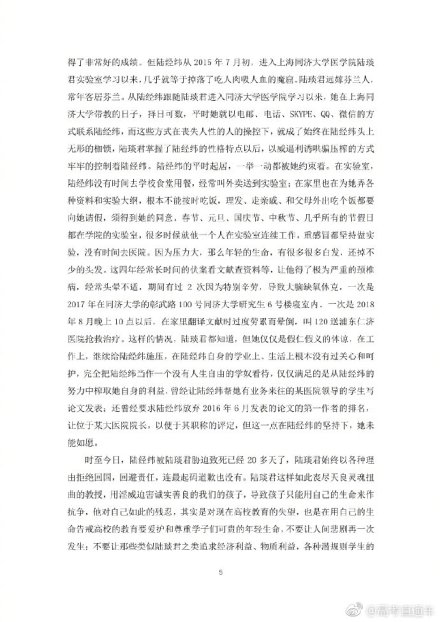 陆经纬2018年12月13日中午在上海同济大学医学院实验楼5楼实验室的坠楼事件,我们家属呼吁应该向社会、向媒体公布,应该正视当前高校教育存在的弊端。规避責任,利益至上的高等教育的管理模式是对类似陆琰君之类导师的纵容和庇护,是高等教育管理的严重缺失!同济大学必须承担全部责任!对于已经逝去的正值青存韶华岁月的陆经纬,决不能以草营人面的方式,漠然处置,必须付出重大代价!才能吸取这样的教训,引以为戒,真正的彻底的杜绝类似事件的发生。中国的高等教育,如果再听之任之,不加以整顿,类似陆经纬的事件和北京交大的事件只怕会越出越多,对学生个人、家庭、社会必将造成重大损失。在此,我们呼吁社会上有良知的人们为孩子们无价的生命呐喊!我们呼吁以习近平总书记为核心的中央领导、国务院领导、国家教育部门领导、以及上海市领导保护我们那些在高校学习的莘革学子们,不再遭受日前高等教育中存在的弊端的伤害!把唯利是图,牺牲学生利益,