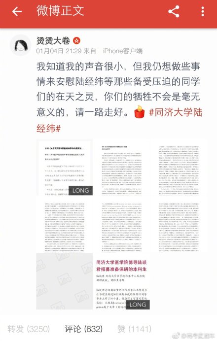 2018年12月13号,同济大学陆经纬坠楼身亡。微博用户“烫烫大卷[微博] ”以家属身份发布长文。