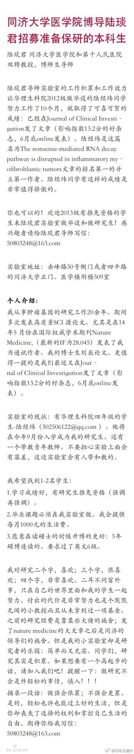 文末附《同济大学医学院博导陆琰君招募准备保研的本科生》的招募公告。