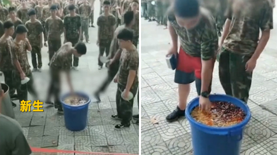 学生吃泔水 教官在一旁发出愉快笑声
