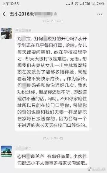 网上流传的多张截图显示,案发前,在一个名为五小某班的班级微信群中,昵称为何某某爸爸的群成员针对刘某宸发信息称,“刘某宸打何某某开心吗?从开学到现在几乎每日打骂……作为家长,何某某妈妈和你沟通好几次,我也劝说过你,但你还是不听……会有一个不讲理的家长天天在校门口等你的。”群里有成员劝慰:“有事好商量,小伙伴们都还小不太懂事,多与家长沟通吧。”另有一张群名称相同的上述班级群聊天截图显示,群内昵称为刘某宸爸爸的群成员在群里@了何某某爸爸:“不好意思,这件事我第一次听说……我加你微信了,咱们沟通下。”