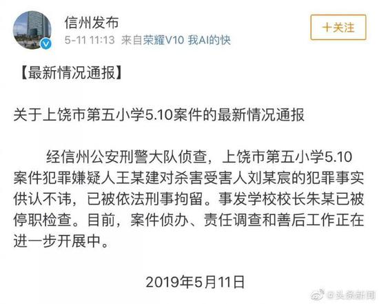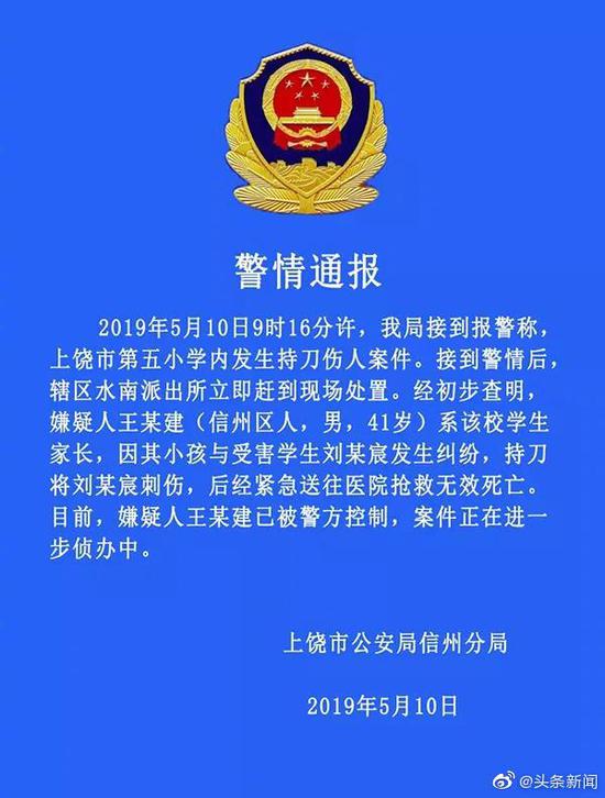 上饶市第五小学10岁男生刘某宸被女同学父亲刺死一事引发关注。根据警方最新通报,嫌疑人王某建已被刑拘,而学校的校长也被停职检查。