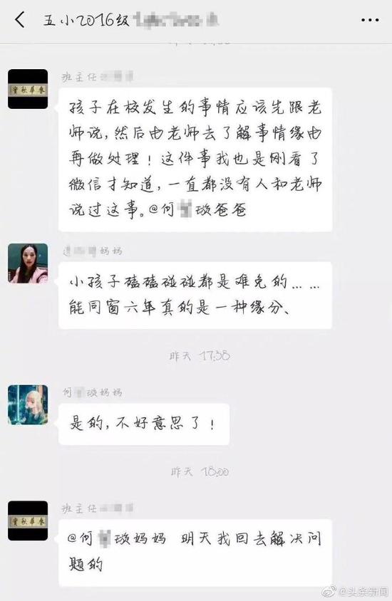还有一张聊天截图显示,在相同名称的班级群里,群内昵称为班主任汪某华的群成员称:“孩子在校发生的事情应该先跟老师说,然后由老师去了解事情缘由再作处理。这件事我也是刚看了微信才知道,一直没有人和老师说过这件事。”最后班主任汪某华称“明天(10日)回来后会处理这件事”,并@了何某某爸爸。