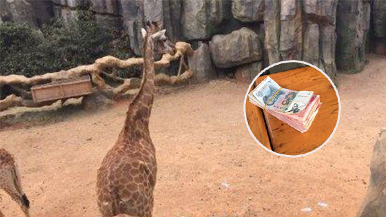 游客投掷人民币喂长颈鹿 工作人员救回万元