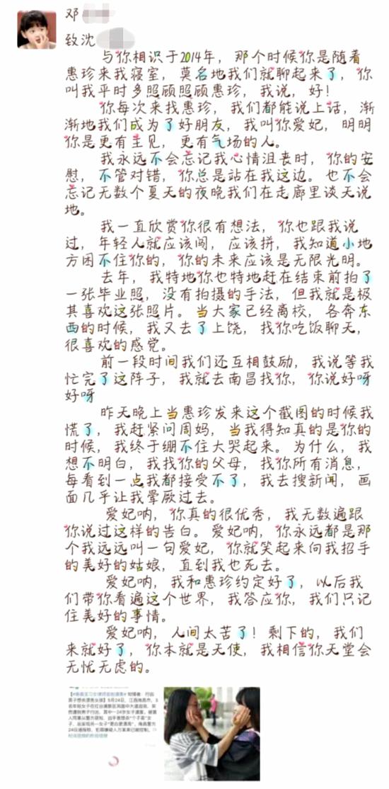 等5点多天亮了我们到了南昌,9点多去的法医基地,看到女儿的样子,一只眼睛瞪着,嘴巴张得的,脖子肩膀全是伤口,满身都是血,那种惨状对我们太残酷了。
