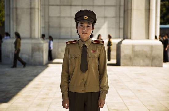 平壤,朝鲜。一位女警官在军事博物馆前守卫