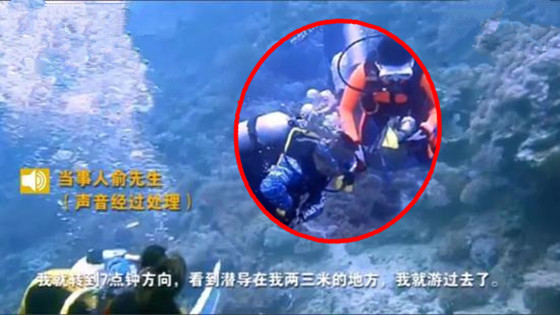 “当时我一边做手势,一边拿自己的气压表给潜导看,想让他知道是气源被切断,但是潜导第一反应是拿出我的备用呼吸头塞到我嘴里。”然而由于气瓶被关,备用呼吸头里没有充气,俞先生猛吸一口直接呛到了海水,他连忙拿开嘴里的备用呼吸头,又连呛了几口海水。潜导见状,直接用自己的备用呼吸头塞进俞先生嘴里,这才让他重新吸到氧气。