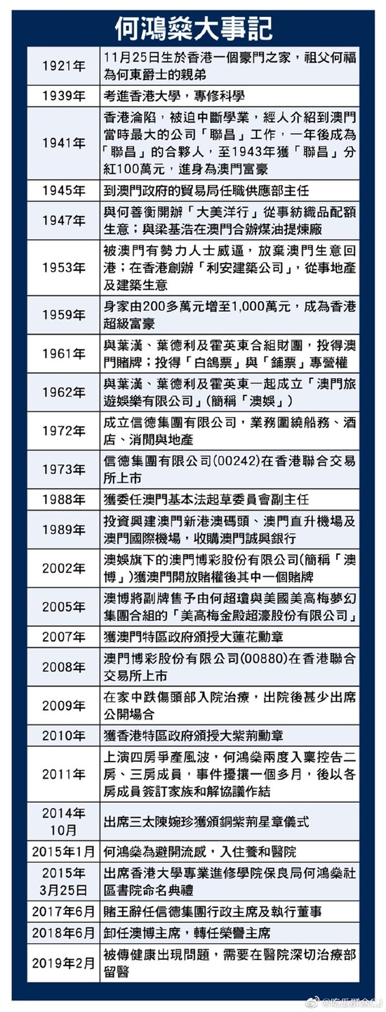 2018年6月12日,何鸿燊卸任公司主席、执行董事等职务,全面退出董事会。近年来,年过九旬的何鸿燊一直健康情况欠佳,长期住院休养,由家人每日轮流前往医院照顾。2019年2月,曾一度传出其病情加重,随后转入重症监护病房(ICU)。